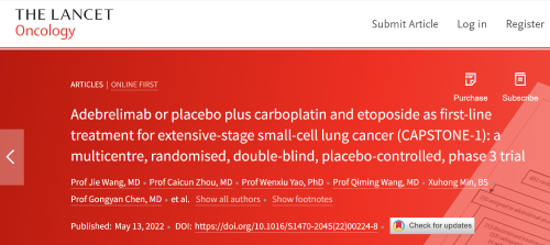 北京时间2022年5月14日,EVO医药自主研发的PD-L1抑制剂阿得贝利单抗治疗广泛期小细胞肺癌的III期临床研究(CAPSTONE-1研究)成果正式全文在线发表于国际权威学术期刊《柳叶刀·肿瘤学》(《THE LANCET Oncology》,影响因子41.316)。CAPSTONE-1研究结果显示,阿得贝利单抗联合化疗一线治疗广泛期小细胞肺癌相较于安慰剂联合化疗可以显著延长患者总生存期至15.3个月[1],刷新现有免疫药物一线治疗广泛期小细胞肺癌的总生存纪录[2]。